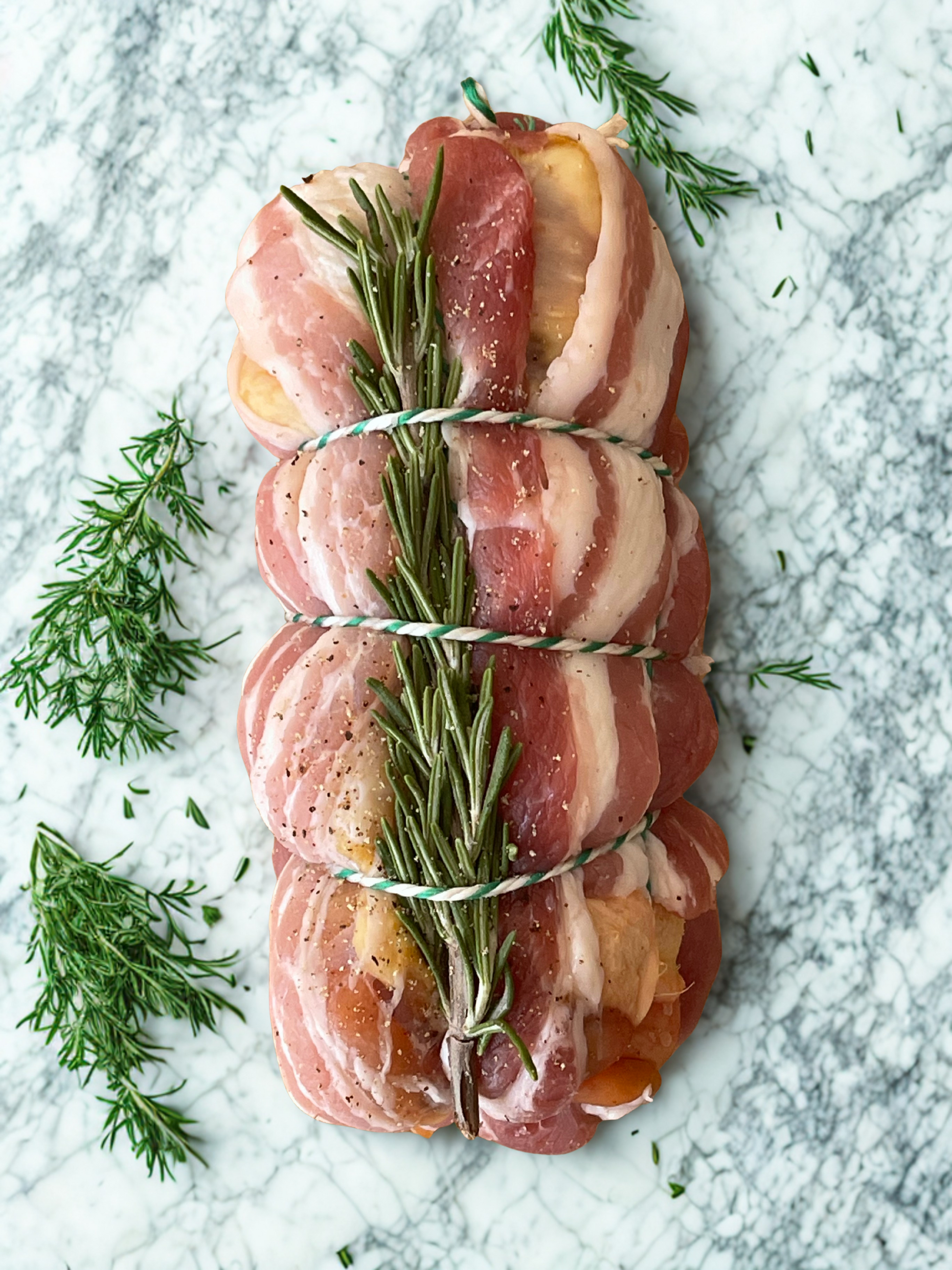 Crafted around the iconic Cumberland sausage, The Cumbrian brings together bold, familiar flavours in a wrap that’s both rustic and refined. A boned-out corn-fed chicken leg is stuffed with mature cheddar, sweet honey-baked gammon, and our signature Vicars Game Cumberland sausage, then wrapped in streaky bacon and tied with butcher’s twine. Finished with a fragrant sprig of rosemary, it’s ready for the oven rich, golden, and deeply satisfying.